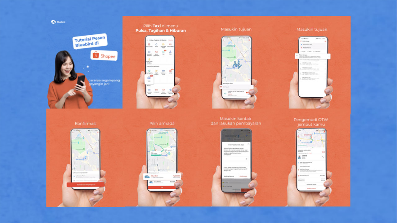 PT Blue Bird Tbk dan Shopee Indonesia kembali merealisasikan komitmen untuk menghadirkan ekosistem digital dalam mempermudah kehidupan pengguna. Bluebird dan Shopee secara resmi meluncurkan fitur pemesanan taksi Bluebird yang dapat diakses melalui aplikasi Shopee.
