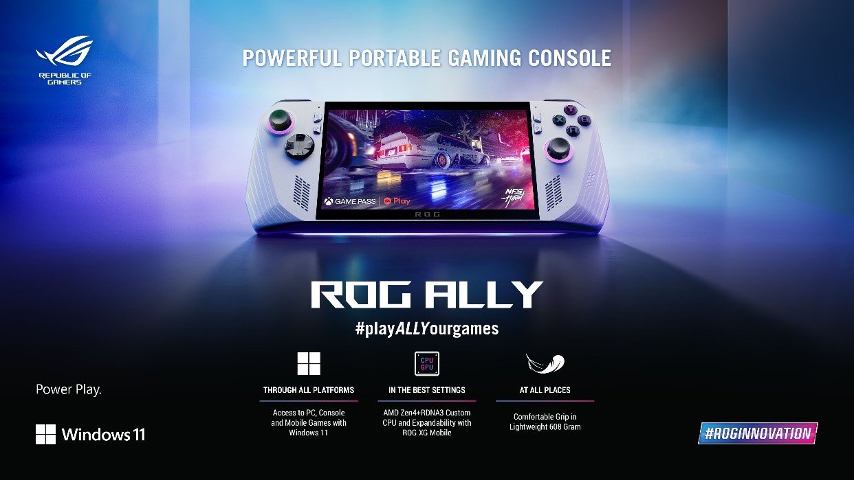 ROG Ally memungkinkan gamer untuk menikmati game AAA secara portabel, terhubung ke televisi, atau difungsikan layaknya sebuah PC desktop menggunakan GPU eksternal ROG XG Mobile. ROG Ally ditenagai oleh prosesor Ryzen Z1 Series terbaru dari AMD.