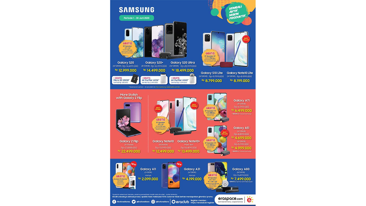Ada juga penawaran Galaxy S10 Lite dan Galaxy Note10 Lite, di mana kedua smartphone ini ditawarkan dengan harga Rp8.799.000 dan Rp8.199.000. Bagi kalian yang tertarik membeli Galaxy Z Flip, smartphone layar lipat ini ditawarkan dengan harga Rp22.499.000 (normal: Rp23.888.000).