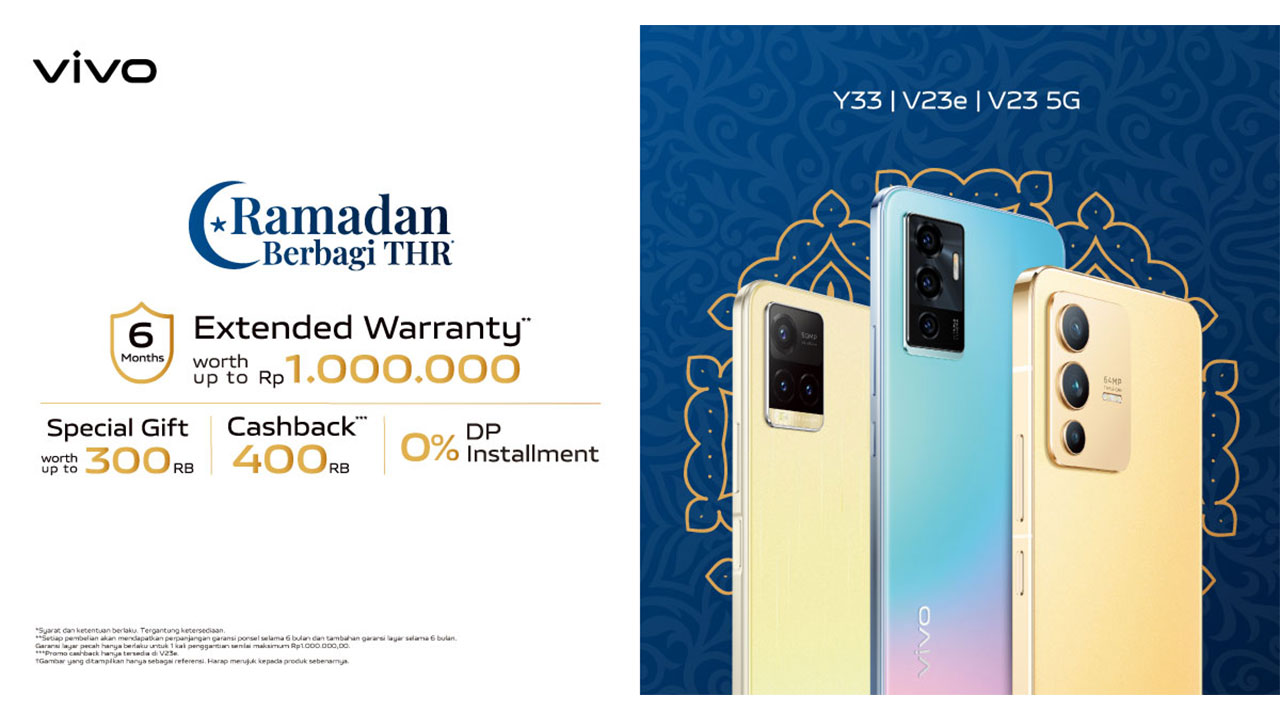 Tidak hanya itu, vivo juga menyuguhkan promo “Ramadan Berbagi THR” yang memberikan penawaran menarik dan potongan harga spesial untuk smartphone terbaik pilihan vivo, seperti vivo V23e, vivo V23 5G, dan vivo Y33s. Promo “Ramadan Berbagi THR”​ ini sudah dapat dinikmati dari tanggal 2 April hingga 10 Mei 2022.