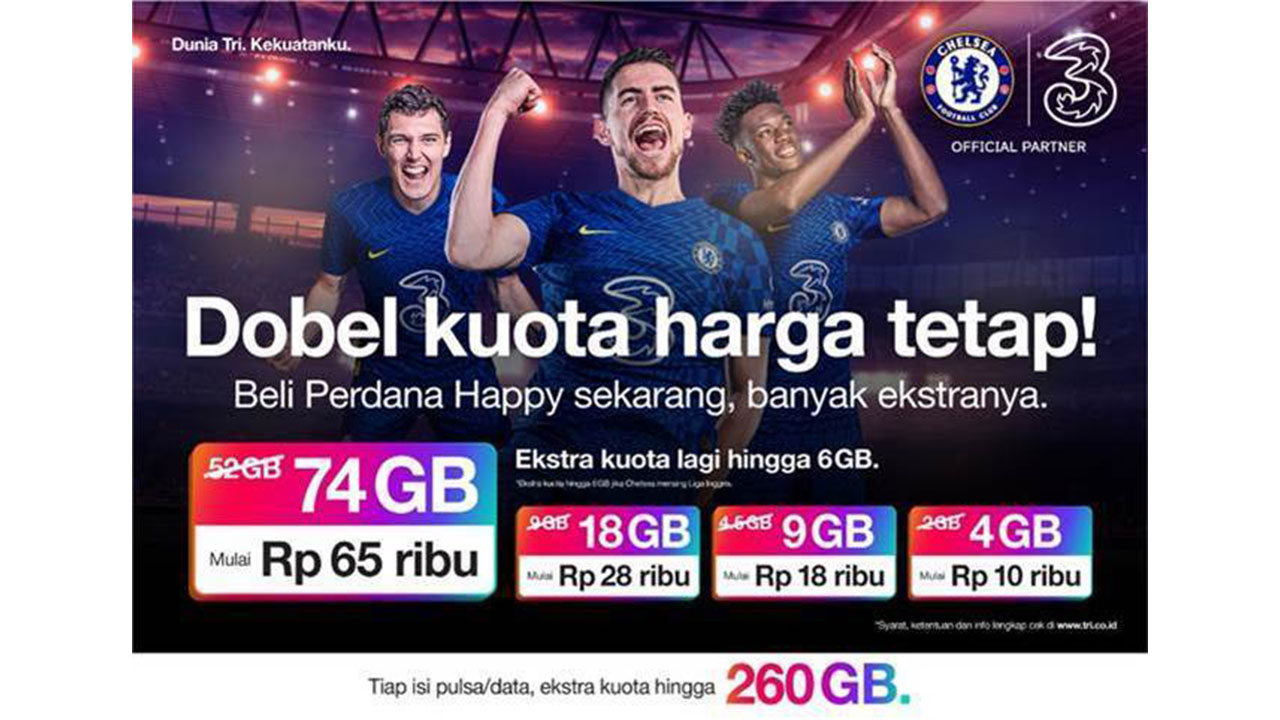Di masa pandemi ini, 3 Indonesia membawa Chelsea FC untuk memberikan semangat optimis kepada masyarakat Indonesia guna menjalani aktivitas digital dengan menghadirkan program Dobel Kuota Harga Tetap. Program ini berikan keuntungan berlipat bagi pengguna Perdana Happy.