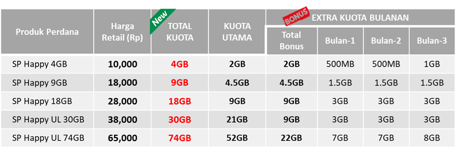 - SP Happy 9 GB dengan harga Rp18.000 akan mendapatkan kuota utama 4.5 GB + ekstra kuota bulanan sebesar 4.5 GB.;