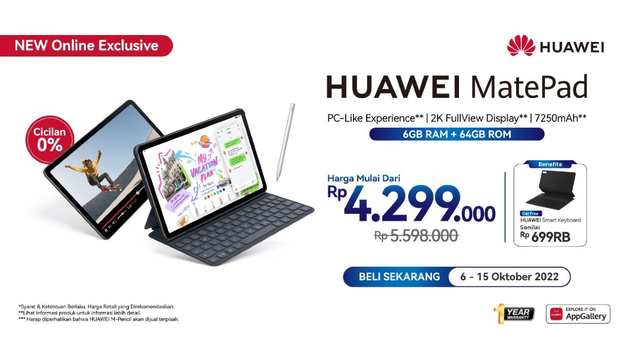 Selain kehadiran HUAWEI MatePad 6 GB + 64 GB, Huawei juga menawarkan berbagai promo spesial 10.10 yang bisa dinikmati oleh pelanggan pada tanggal 6 hingga 12 Oktober 2022, eksklusif melalui Huawei Official Store di Shopee, Tokopedia, Blibli, Lazada, dan JD.ID.