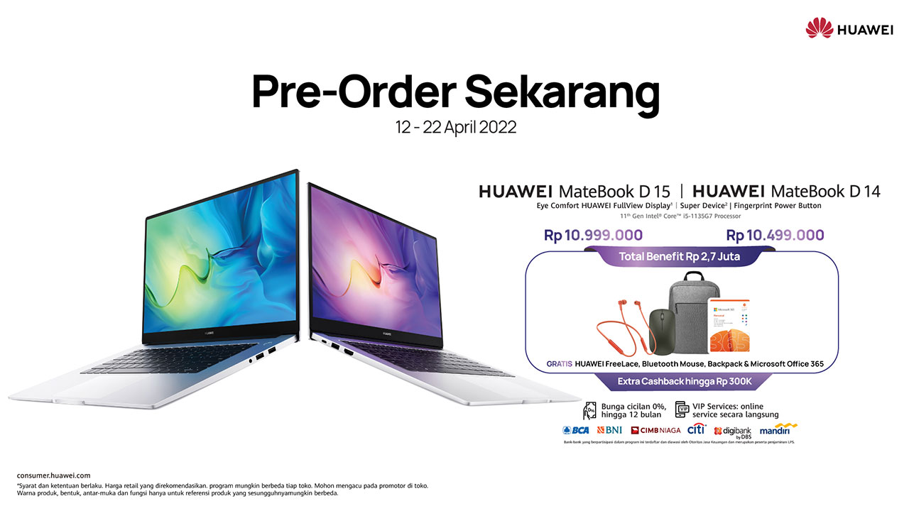 Adapun harga yang ditawarkan adalah Rp10.499.000 untuk HUAWEI MateBook D14 dan Rp10.999.000 untuk HUAWEI MateBook D15. Untuk setiap pembelian salah satu dari dua seri laptop tersebut, pelanggan berhak mendapat bonus beragam bonus menarik.
