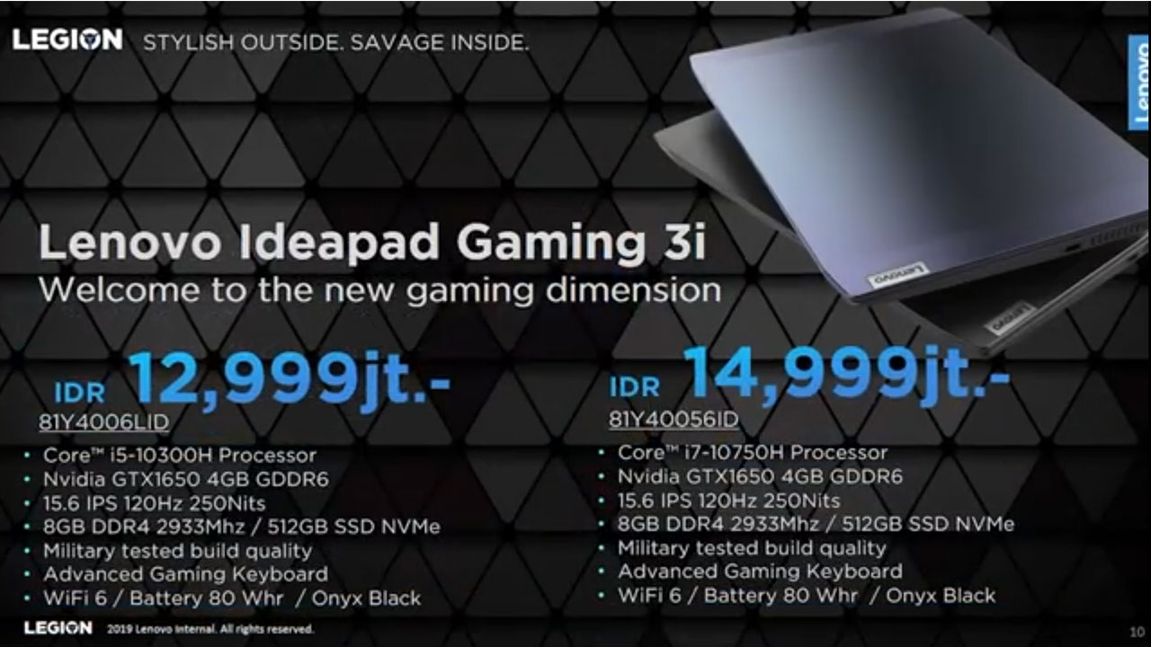 Lenovo juga menawarkan Ideapad Gaming 3i dengan konfigurasi Intel Core i7, NVIDIA GTX1650, RAM 8+8 GB, SSD 512 GB, Chameleon Iridiscent seharga Rp16 juta. Model lainnya, yakni dengan konfigurasi Intel Core i7, NVIDIA GTX1650Ti, RAM 8+8 GB, SSD 512 GB, Onyx Black ditawarkan seharga Rp17 juta.