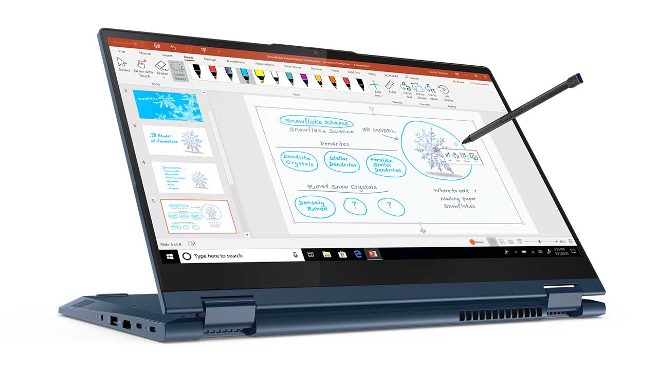 ThinkBook 14s Yoga hadir dalam empat mode penggunaan yaitu penggunaan laptop, tablet, tent dan present. Fleksibilitas yang ditunjukkan oleh laptop ini memudahkan pengguna jika ingin menggunakannya sebagai tablet dengan dukungan Smart Pen.