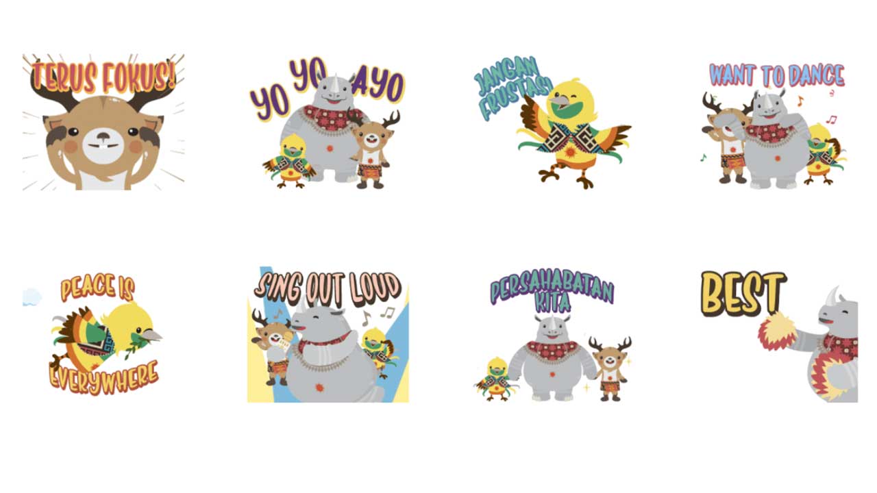 Ada 8 buah stiker yang menampilkan Bhin Bhin, Atung, dan Kaka dengan ragam ekspresi yang merepresentasikan keseruan Asian Games 2018. Masing-masing stiker juga bisa memperdengarkan lagu-lagu andalan tema Asian Games 2018, salah satunya Meraih Bintang (Via Vallen).