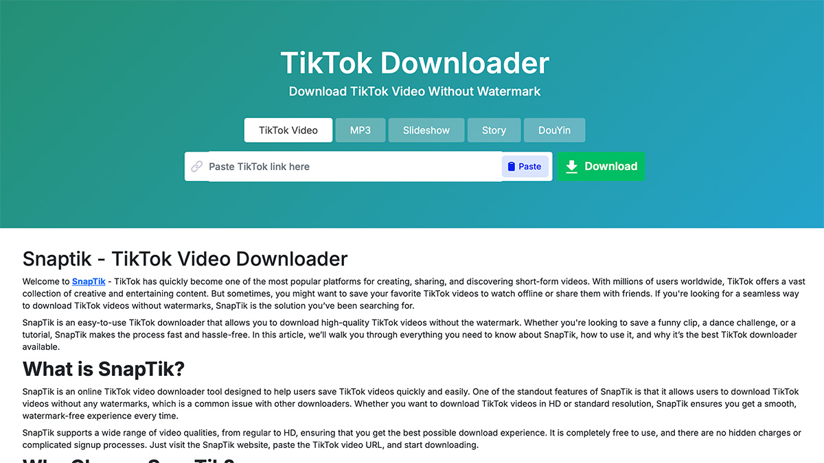 SnapTik jadi andalan karena tampil simpel tapi fungsinya maksimal. Nggak cuma buat koleksi konten viral, SnapTik juga berguna banget buat kamu yang aktif bikin konten ulang, share video edukatif, atau sekadar pengin simpen momen lucu dari TikTok buat ditonton offline kapan aja.