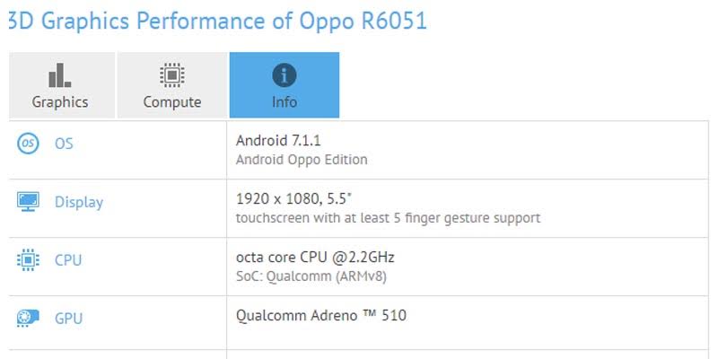 Selanjutnya, baru-baru ini GFXBench mengungkapkan smartphone terbaru OPPO yang sedang dikembangkan, yakni OPPO R6051. Perangkat yang satu ini memiliki prosesor Qualcomm Snapdragon 660 octa-core berkecepatan 2,2 GHz, prosesor grafis Qualcomm Adreno 510, RAM 4 GB, dan penyimpanan internal 64 GB.