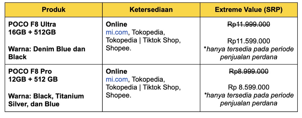 “Sudah jadi DNA POCO untuk selalu berani, berbeda, dan terus mendobrak batas. Karena kami tahu kalian selalu haus performa ekstrem, tahun ini kami nggak mau kasih yang setengah-setengah. Buat POCO Fans di Indonesia, kami langsung bawa lini terkuat: POCO F8 Pro dan POCO F8 Ultra! Inilah wujud nyata Ultrapower Ascended, yang kasih kalian performa buas sampai kolaborasi audio yang bikin lawan tiarap. Saatnya dominasi level tertinggi dan buktiin kalau kalian adalah hardcore gamer tanpa rasa takut!” ujar Novita Krisutami, PR Manager POCO Indonesia.