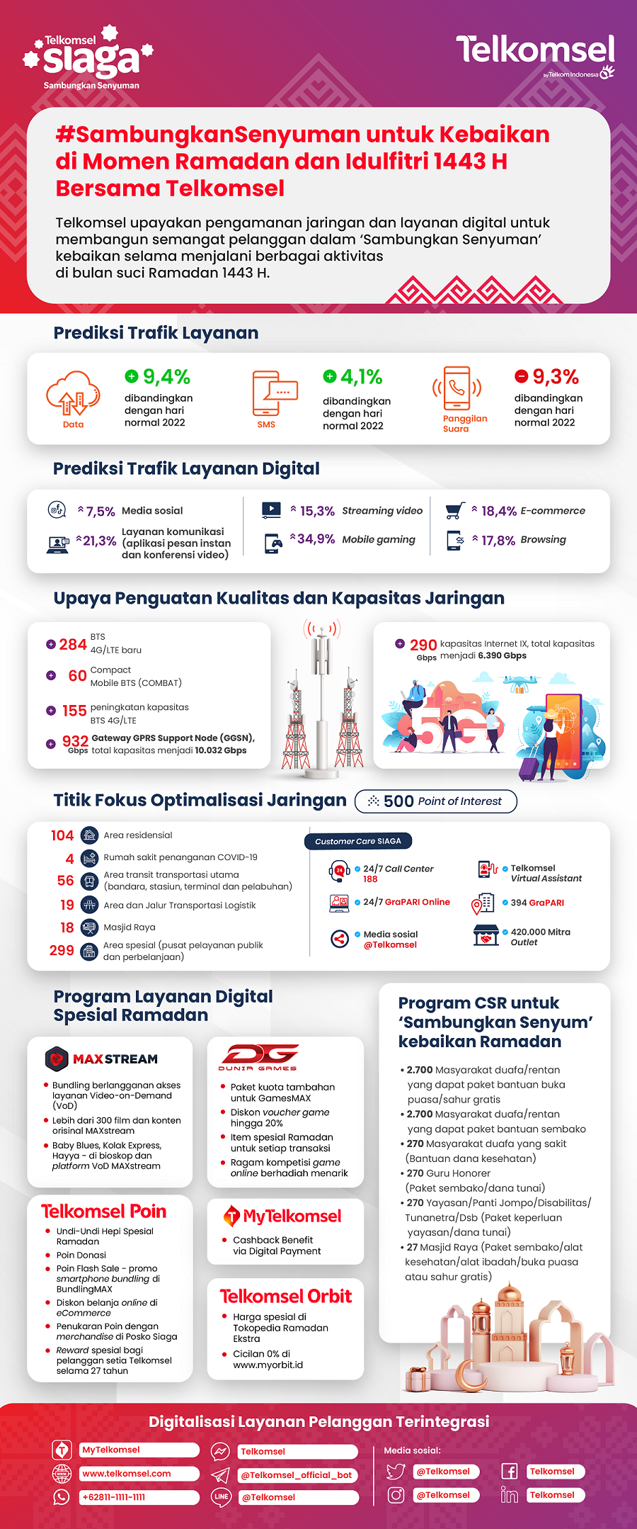 Telkomsel konsisten memperkuat perannya sebagai society enabler melalui kepemimpinan teknologi terdepan dalam memaksimalkan pengalaman digital bagi seluruh pelanggan di setiap aktivitas digital dan ibadah di bulan suci Ramadan 1443 H.