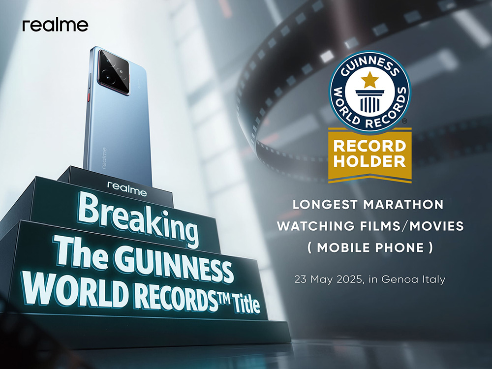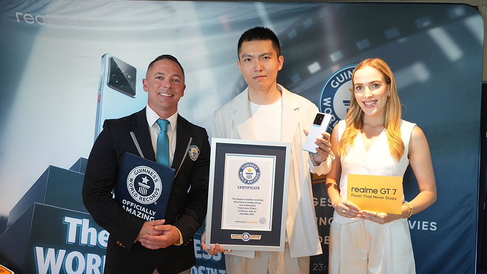 Genoa, Italia, 24 Mei 2025— Brand smartphone global realme kembali menunjukkan keunggulan teknologinya. Pada malam tanggal 23 Mei 2025, dalam acara kapal cruise Eropa bertajuk “Endless Power Journey”, perangkat flagship terbaru realme GT 7, berhasil menantang dan memecahkan Guinness World Records untuk Record for the Longest Marathon Watching Films/Movies di smartphone. Dengan pemutaran film nonstop selama 24 jam penuh, realme GT 7 tidak hanya lolos uji daya tahan baterai dengan hasil luar biasa, tetapi juga menetapkan standar baru untuk ketahanan baterai smartphone, serta mendapat pengakuan resmi dari Guinness World Records.