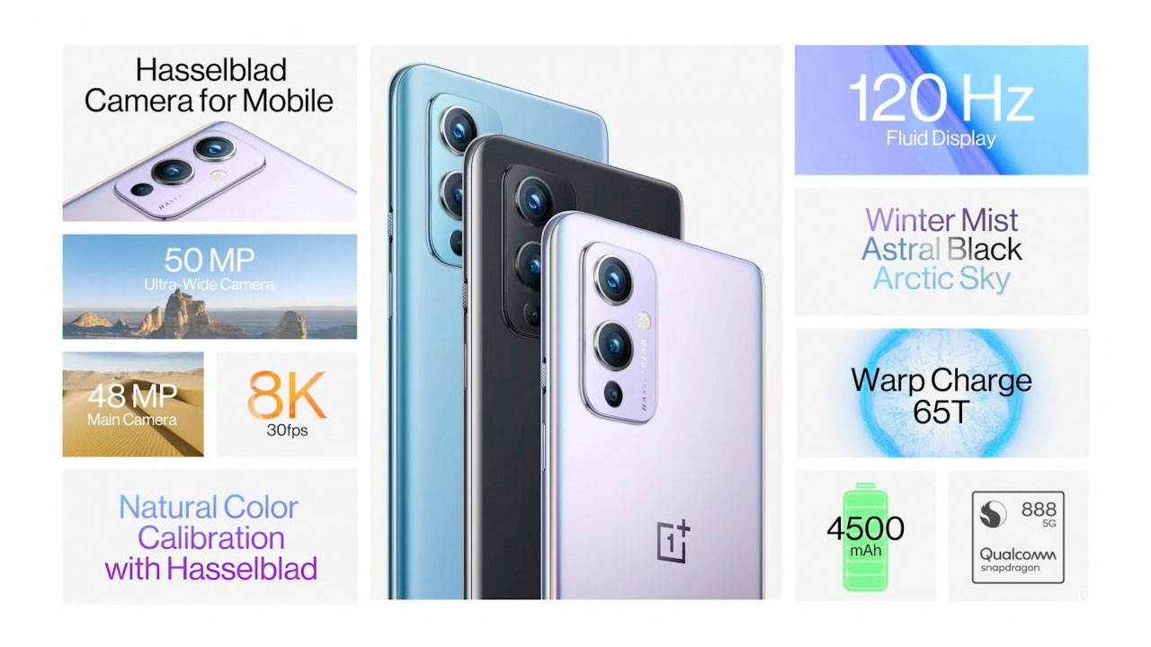 OnePlus 9 mendapatkan versi “parred” dari kamera Hasselblad. Modul utama beralih ke sensor IMX689 yang lebih lama, masih merupakan sensor 1/1,43 inci 48 MP dengan lensa on-chip 2×2, ISO asli ganda, dan output RAW 12-bit. DOL-HDR diganti dengan HDR konvensional.