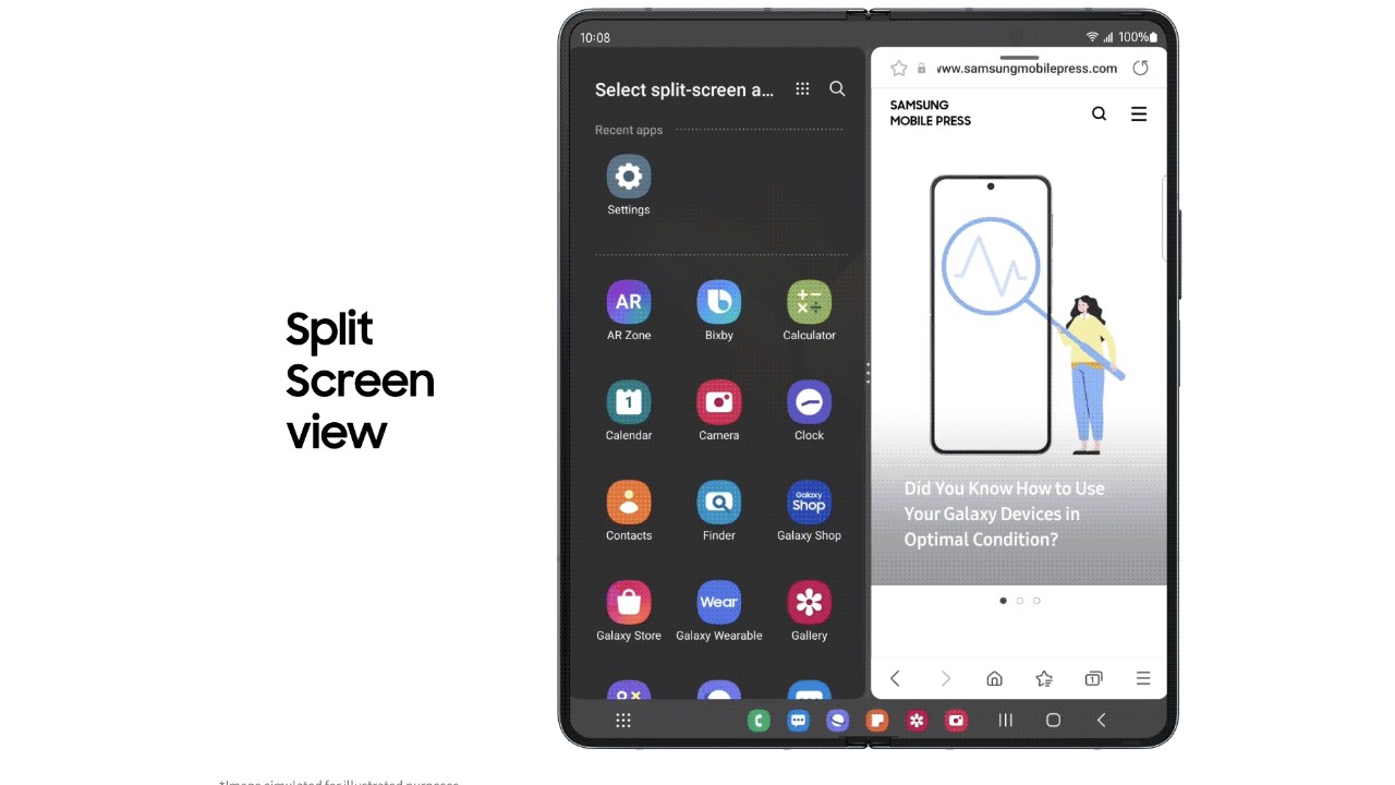 Dengan dukungan drag-and-drop langsung dari Taskbar, multitasking di Galaxy Z Fold lebih mudah. Kalian tinggal menggeser aplikasi pada Taskbar ke bagian pinggir layar untuk tampilan split view. Sementara, tampilan pop-up view dapat diakses dengan menggeser aplikasi ke tengah layar.