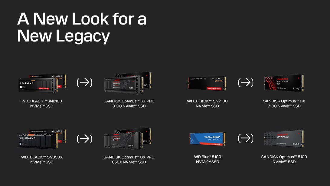 - Lini produk SANDISK Optimus™ GX – bermain game tanpa batas, lini ini dirancang untuk para pemain game yang menginginkan waktu loading yang lebih cepat, menambahkan kapasitas, dan efisiensi daya. Sebelumnya produk ini bermerek WD_BLACK™, termasuk WD_BLACK SN7100 NVMe SSD.
