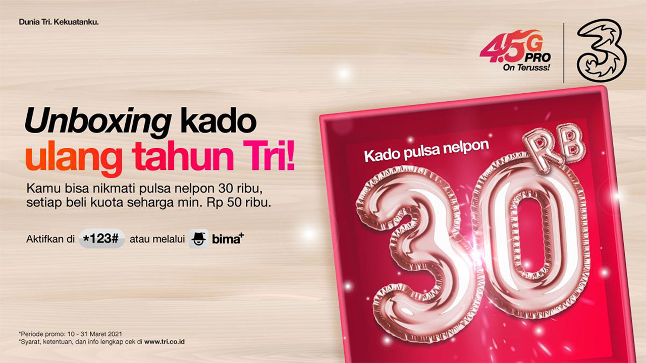 Pada momen ini, 3 Indonesia menawarkan “Kado Pulsa Nelpon 30.000” untuk pelanggan layanan prabayar yang melakukan pembelian paket atau produk-produk 3 Indonesia seharga minimal Rp50.000 melalui bima+ dan atau USSD *123#.