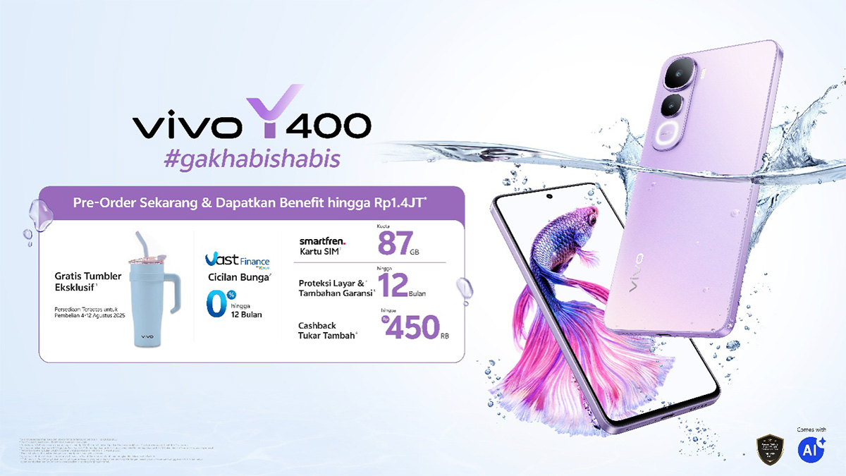 vivo Indonesia secara resmi meluncurkan vivo Y400, smartphone terbaru dari Y Series yang menghadirkan pengalaman all-rounder dengan kombinasi unggulan, desain Layar Flat Flagship dan Layar Borderless pertama di Y Series, layar AMOLED 120Hz Ultra Terang, sertifikasi IP68/69 Tahan Air Ekstrem, 50MP Sony Kamera Underwater, baterai jumbo 6000mAh Tahan 2 Hari, dan fitur AI yang lengkap untuk produktivitas dan kreasi konten, dalam satu paket yang stylish dan terjangkau. Tersedia dalam dua pilihan varian memori, 8+128GB seharga Rp3.199.000 dan 8+256GB seharga Rp 3.499.000, vivo Y400 dapat mulai dipesan melalui program pre-order mulai tanggal 4-8 Agustus 2025.