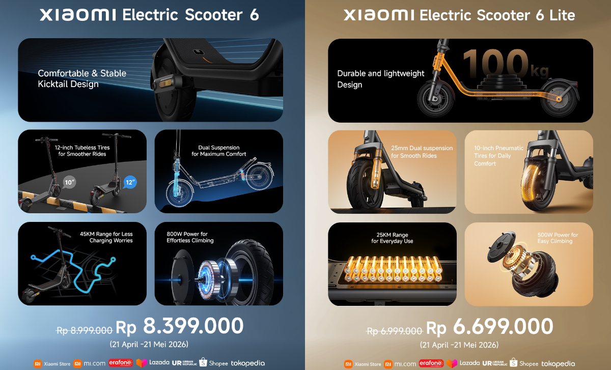Xiaomi Electric Scooter 6 Series bisa Anda dapatkan pada saat periode first sale dimulai di 21 April 2026 melalui kanal penjualan resmi Xiaomi Indonesia, baik secara online di Tokopedia, Shopee, Lazada maupun offline di Xiaomi Store, Mi.com, Erafone, Urban Republic.