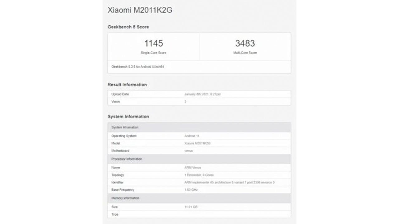 Untuk memperkuat informasi tersebut, daftar Geekbench terbaru juga menunjukkan perangkat dengan nomor model M2011K2G dan “Venus”. Smartphone tersebut akan berjalan dengan chipset Snapdraon 888, RAM sebesar 12 GB dan sistem operasi Android.