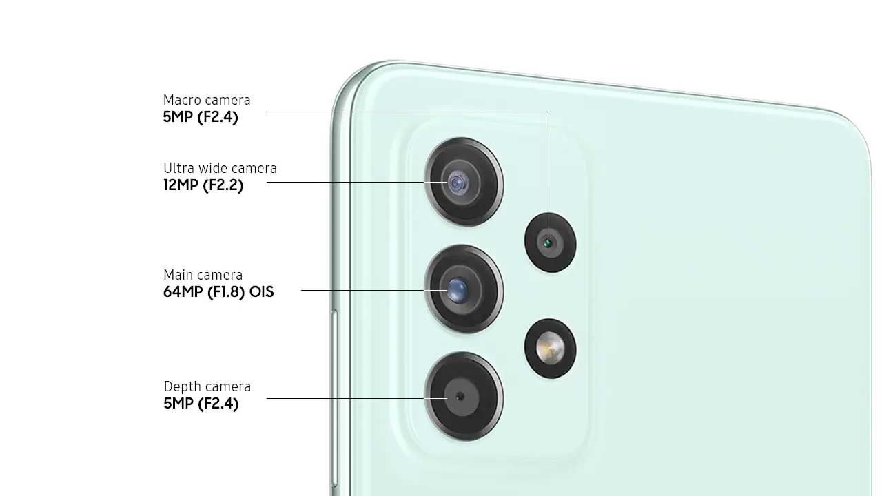 Masih sama dengan model vanilla Galaxy A52, Samsung juga mempersenjatai Galaxy A52s 5G dengan empat kamera di bagian belakang. Teknologi Quad Camera yang terdiri dari kamera utama 64 MP, lensa ultra-wide 12 MP, lensa depth 5 MP, dan lensa makro 5 MP.