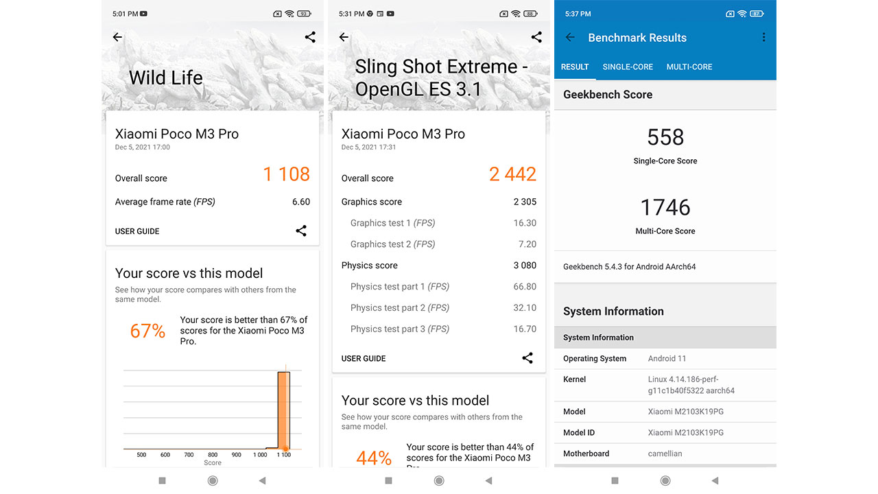 Ya! Menguji smartphone ini untuk bermain game adalah bukti nyata untuk mengetahui performa POCO M3 Pro 5G secara langsung. Namun, Droidlime juga melakukan pengujian alias benchmarking menggunakan aplikasi 3D Mark dan Geekbench, hasilnya seperti di bawah ini.